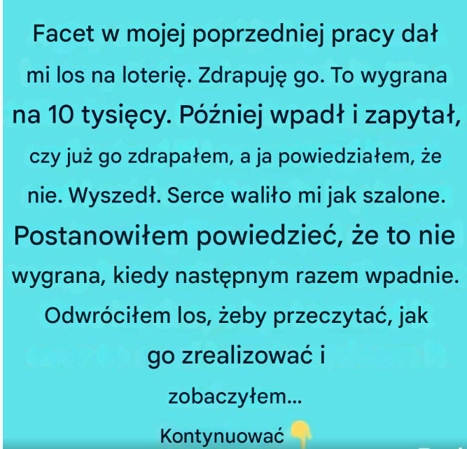 Facet w mojej poprzedniej pracy dał mi los na loterię. Zdrapuję go. Wygrywa 10 tysięcy. Później wpadł i zapytał, czy już go zdrapałem, a ja powiedziałem, że nie. Wyszedł. Serce biło mi jak szalone.