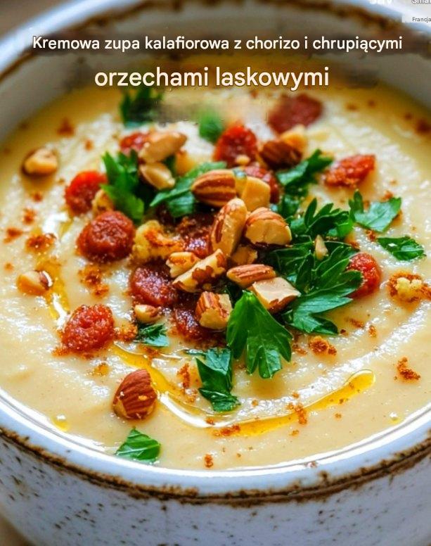 Kremowa zupa kalafiorowa z chorizo i chrupiącymi orzechami laskowymi łączy prostotę kuchni warzywnej z wyrazistą, lekko pikantną nutą. Delikatny, aksamitny krem kalafiorowy stanowi idealne tło dla intensywnego smaku chorizo i subtelnych, orzechowych nut prażonych orzechów laskowych. To idealna propozycja zarówno na codzienne obiady, jak i bardziej formalne spotkania.