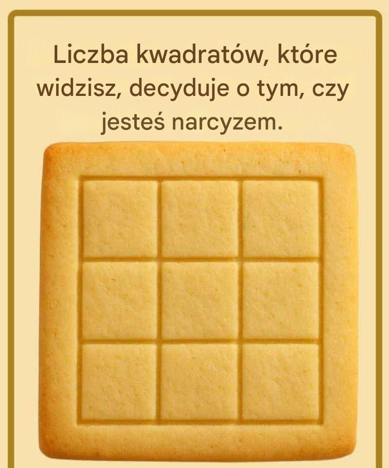 Na pierwszy rzut oka ten prosty obrazek, przypominający ciasteczko, wydaje się nieszkodliwy: prosta kratka wyryta w cieście. Ale pytanie, które go poprzedza: „Liczba kwadratów, które widzisz, decyduje o tym, czy jesteś narcyzem”, wywołuje dyskusję. To zabawna iluzja psychologiczna, która stała się viralem w internecie, wywołując tysiące debat. Przyjrzyjmy się, co ta zagadka tak naprawdę ujawnia na temat twojego myślenia, twojej zdolności obserwacji i, owszem, czy pod pozorem spokoju nie ukrywasz jakichś narcystycznych tendencji.