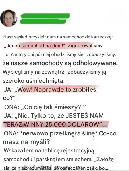 Jack i ja ledwo zaczęliśmy się urządzać w małym domu do wynajęcia, który wybraliśmy na nasz sześciomiesięczny przydział służbowy, gdy wszystko potoczyło się zupełnie inaczej, niż się spodziewaliśmy. Okolica, na pierwszy rzut oka, wydawała się idealna – cicha, czysta i wtopiona w podmiejską zabudowę, gdzie każdy trawnik pasował do drugiego, a każdy dom wyglądał na zaprojektowany według tego samego projektu. Dotarliśmy późnym popołudniem poprzedniego dnia, wyczerpani podróżą i gotowi na prosty, spokojny wieczór. Sam dom był skromny, ale wygodny, z wąskim podjazdem, który jakimś cudem bez problemu zmieścił oba nasze samochody. Większość kartonów do przeprowadzki ułożyliśmy w salonie i umówiliśmy się, że rozpakujemy je „w końcu”. Na razie chcieliśmy po prostu odpocząć. Ale gdy następnego ranka siedzieliśmy przy kuchennym blacie, popijając kawę i delektując się rzadkim spokojem pustego grafiku, donośne pukanie wyrwało nas z naszego spokojnego początku. Wymieniłam spojrzenia z Jackiem, który uniósł brew i bezgłośnie zapytał: „Czy spodziewamy się kogoś?”. Nie spodziewaliśmy się. Ostrożnie otworzyłem drzwi – i oto, na wycieraczce, stała kobieta o uśmiechu tak szerokim, że aż niepokojącym. Trzymała tacę z ciasteczkami ułożonymi z niemal niesamowitą precyzją, każde identyczne pod względem wielkości i kształtu, jakby wyrabiano je w fabryce, a nie w kuchni.