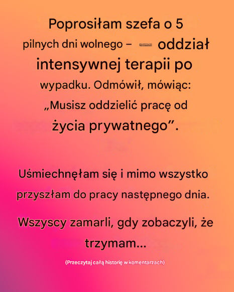 Poprosiłam o pięć pilnych dni wolnego, bo mój syn leżał na OIOM-ie w stanie krytycznym. Szef odmówił. Powiedział: „Musisz oddzielić pracę od życia prywatnego”. Uśmiechnęłam się, przespałam kilka godzin i zjawiłam się następnego ranka – przepychając łóżko syna przez hol. Kroplówki. Monitory. Pielęgniarka szła za mną, zaskoczona, ale milcząca. Ochroniarz próbował mnie powstrzymać, więc powiedziałam mu: „Zadzwoń do pana Mansona. Będzie chciał to zobaczyć”.