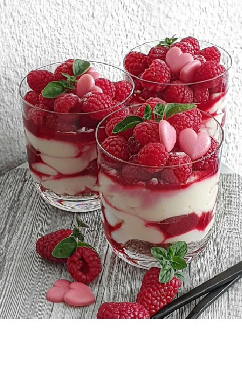Składniki potrzebne na krem: 100 gramów mascarpone 200 g kwaśnej śmietany i twarogu 150 g jogurtu naturalnego 50 g granulowanego cukru 200 ml bitej śmietany 150 g świeżych malin 100 g chrupiącego (moze i bez) Składniki potrzebne na sok malinowy: 200 g malin (mrożonych) 50 gramów wydzieliny 3 łyżki soku z cytryny Przygotowanie :