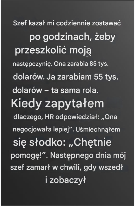 Wiedziałem, że coś jest nie tak, gdy tylko szef poprosił mnie, żebym zostawał po godzinach przez cały tydzień, żebym mógł przeszkolić kobietę, która miała zająć moje miejsce. Prośba zabrzmiała dziwnie ostro w jego głosie, coś, co sprawiło, że ścisnęło mnie w żołądku. Mimo to nic nie mogło mnie przygotować na to, co przedstawiciel działu kadr powiedział mi nonszalancko następnego ranka. Moja następczyni miała zarabiać osiemdziesiąt pięć tysięcy dolarów za dokładnie tę samą pracę, którą ja wykonywałem za pięćdziesiąt pięć tysięcy. Zapytałem, jak można uzasadnić taką różnicę. Dział kadr wzruszył ramionami i powiedział, że po prostu lepiej wynegocjowała. Słowa te wylądowały we mnie z głuchym hukiem. Poczułem, że coś się zmienia, coś spokojnego i zdecydowanego. Zamiast się sprzeciwiać, uśmiechnąłem się i zgodziłem się ją przeszkolić.