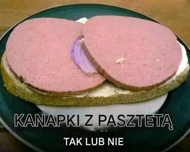 Połóż na wierzchu cienko pokrojoną czerwoną cebulę i ogórki konserwowe. Pasztetowa.
