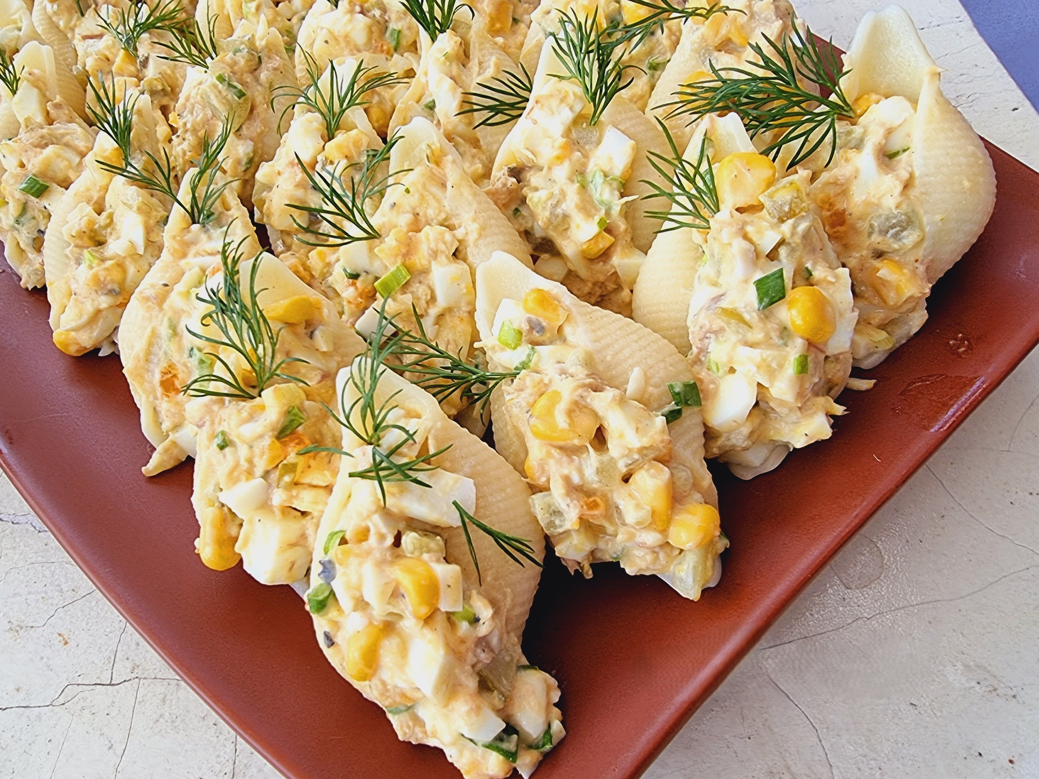 Sałatka jajeczna z rybką w makaronowych muszlach