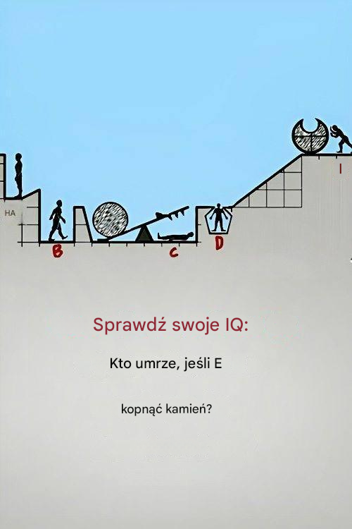 Dzisiejsza łamigłówka wymaga dogłębnej analizy i podstawowej wiedzy z fizyki. Ale nawet jeśli nie jesteś ekspertem w tej dziedzinie, dobre umiejętności obserwacji mogą wystarczyć do jej rozwiązania. Obrazek łamigłówki przedstawia pięć osób oznaczonych literami od A do E. E wpycha kamień po zboczu. Kamienie są na tyle oddalone od siebie, że mieści się w nich jego głowa.